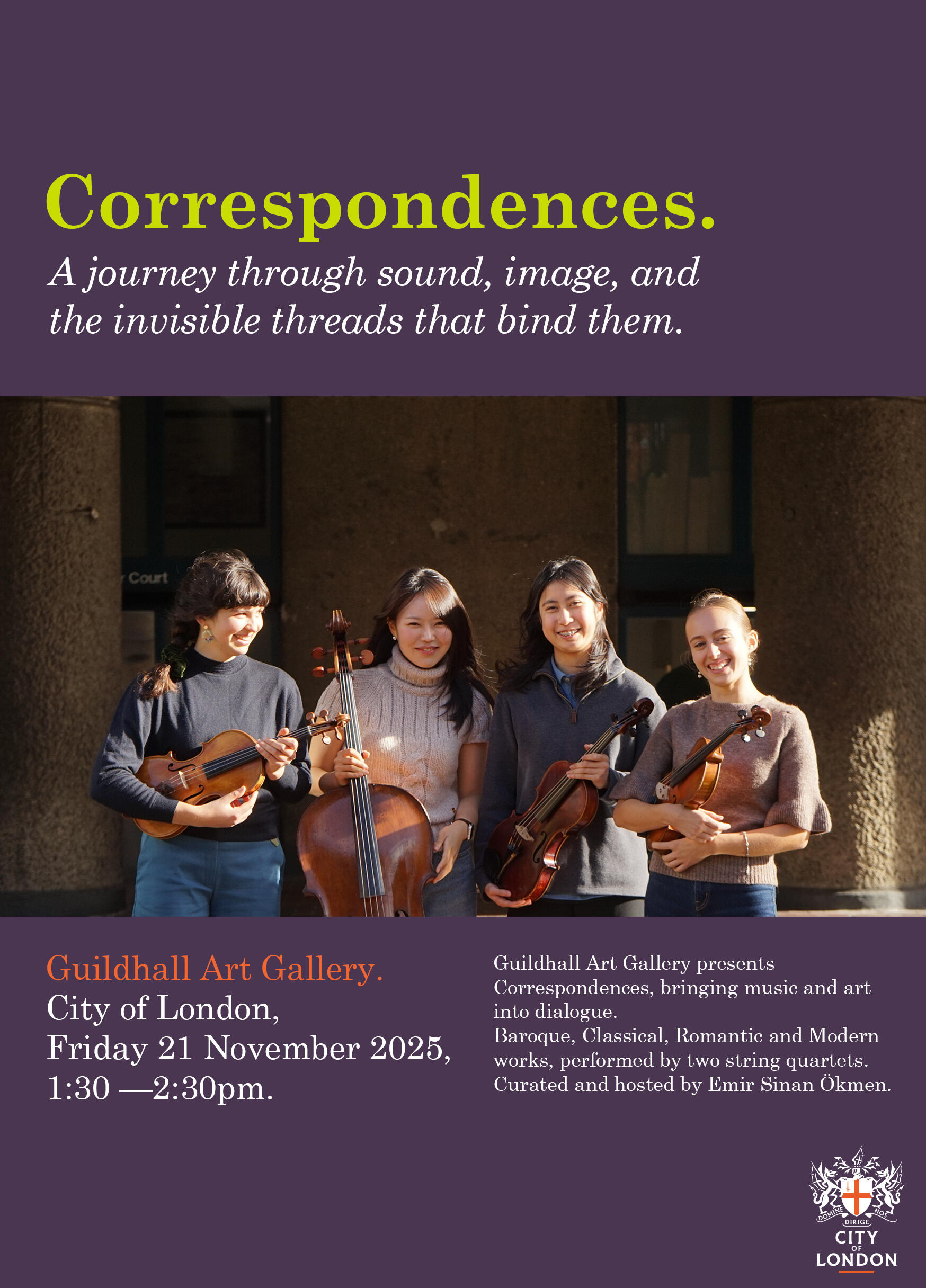 Inspired by Baudelaire’s vision of hidden connections between nature, art, and emotion, 'Correspondences' is an hour-long concert that is curated, organised and presented by Emir Sinan Ökmen, which takes place at Guildhall Art Gallery on 21 November, 2025.From the quiet contemplation of the Baroque to the bold textures of the Early Modern era, the programme invites listeners to experience music as an echo of the visual and emotional worlds that surround it.Performed by two string quartets from the Guildhall School of Music & Drama, each segment is framed by a brief reflection linking the music to artworks within the Guildhall Art Gallery, revealing how artistic forms converse across time.Correspondences invites the audience into a living dialogue between sound and image, history and feeling, reason and reverie.